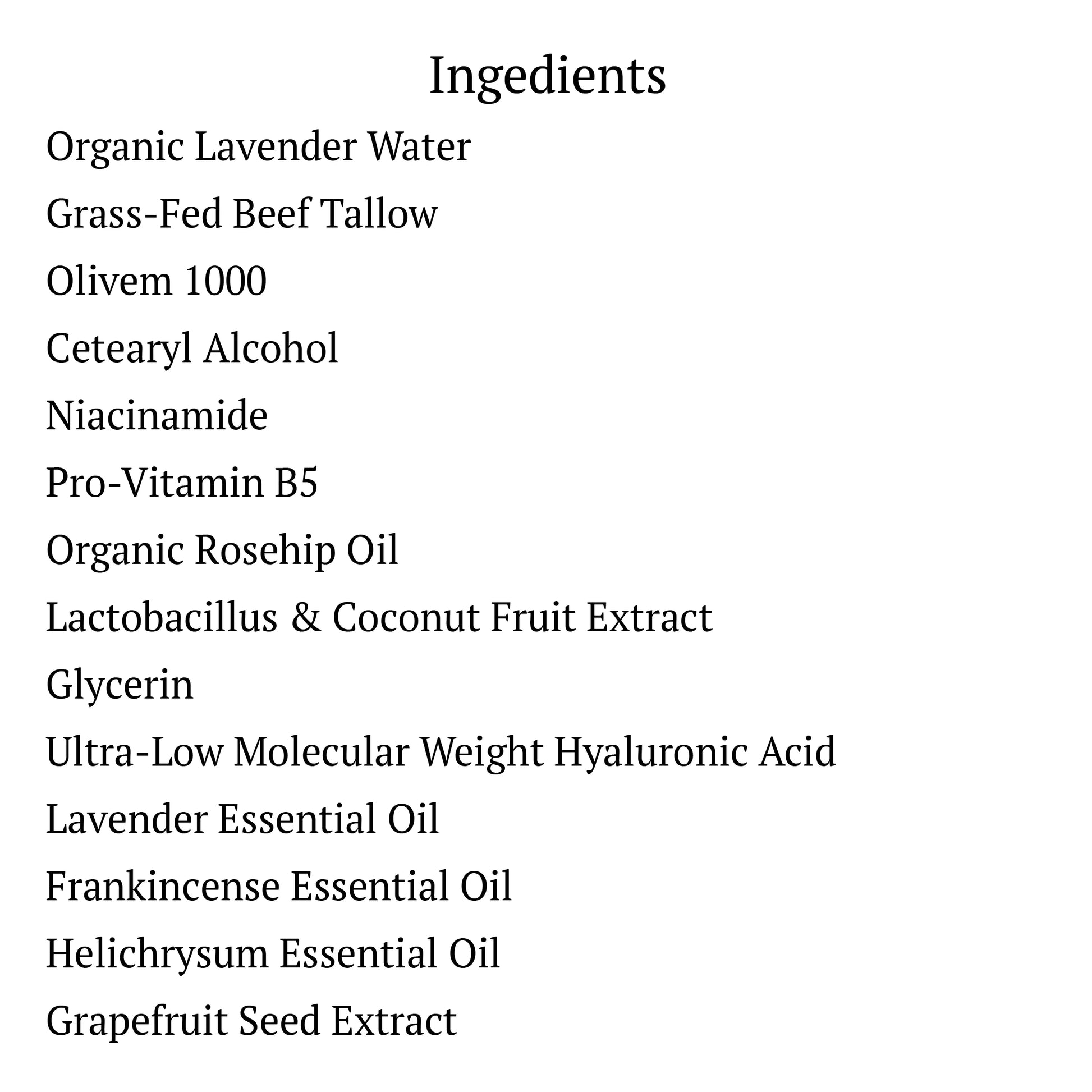 A rare union of grass-fed tallow, niacinamide, pro-vitamin B5, hyaluronic acid, and essential oils of lavender, frankincense, and helichrysum. Handcrafted in small batches and naturally preserved to honor the integrity of every ingredient. Designed to rejuvenate, heal, and shield your skin daily.